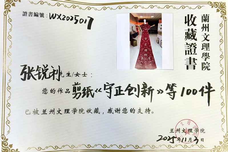 张锐利长期致力于庆阳剪纸的保护与创新,曾受邀为我校文学院非遗保护专业学生授课,系统传授剪纸技艺与文化内涵。此次捐赠的作品凝聚其二十余年的创作成果,其中“守正创新”主题披肩式剪纸等创新作品,现陈列于我校非遗知识馆,受到师生广泛关注。