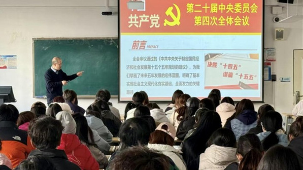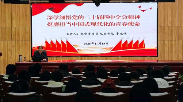 11月21日,校党委委员、副校长李敏骞为后勤管理处、美术与设计学院、音乐舞蹈学院、艺术职业学院等单位师生代表作专题宣讲,他结合学习体会,系统解读“十五五”时期指导方针、基本原则和经济社会发展目标,强调要将学习贯彻全会精神作为首要政治任务,要求师生准确把握其核心要义与实践要求,自觉在思想上政治上行动上同党中央保持高度一致。