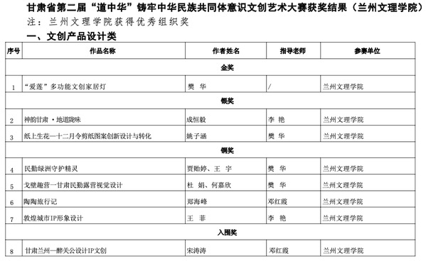 近日,甘肃省第二届“道中华”铸牢中华民族共同体意识文创艺术大赛获奖名单正式揭晓。我校师生积极参与,作品质量突出,在本次赛事中斩获多项奖项,展现出丰硕的育人成果与蓬勃的创作活力。