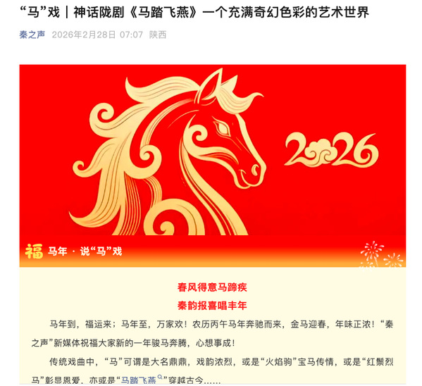 马年春节之际,陕西广播电视台知名戏曲栏目《秦之声》通过新媒体平台,以《“马”戏|神话陇剧〈马踏飞燕〉一个充满奇幻色彩的艺术世界》为题,对我校原创陇剧教学剧目《马踏飞燕》进行了专题推介,将这部融合甘肃两大文化符号的作品带入更广泛的关注范围和传播视野。