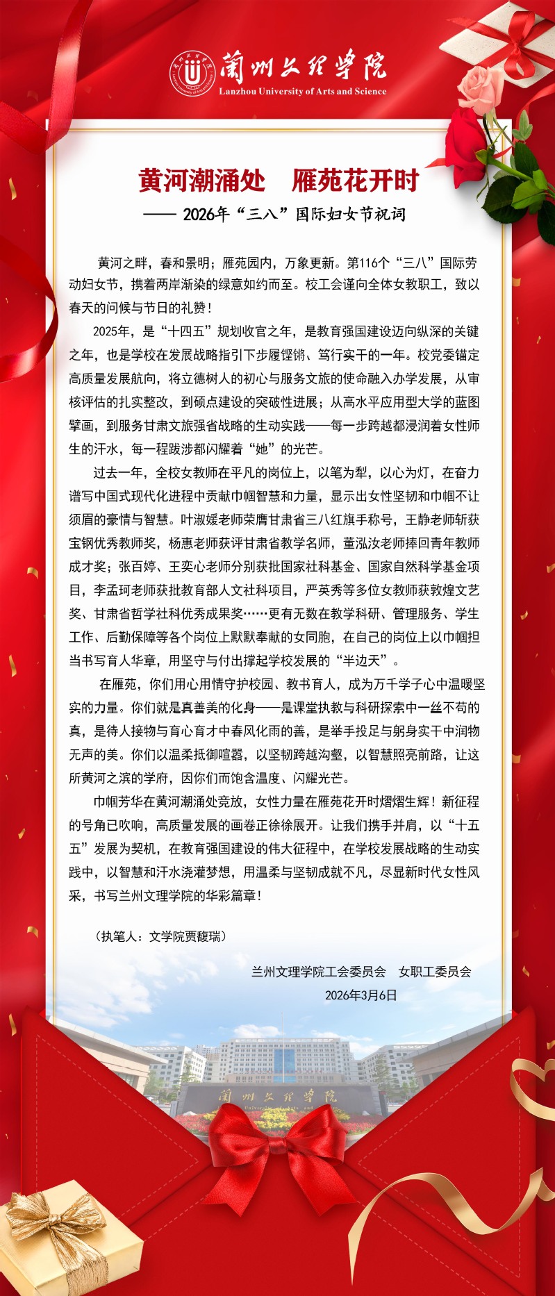 黄河潮涌处 雁苑花开时——2026年“三八”国际妇女节祝词