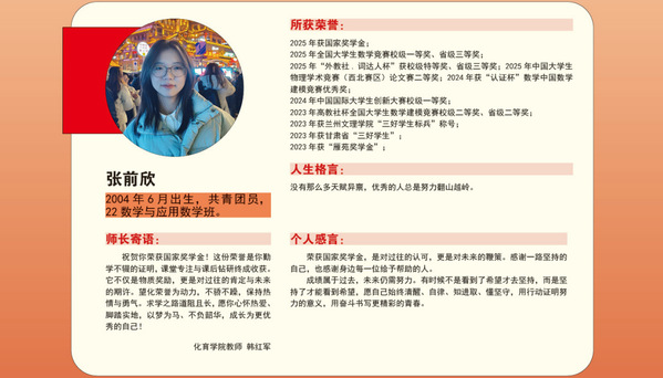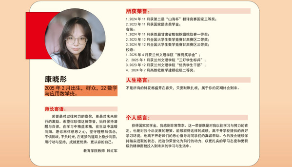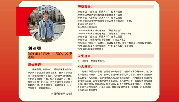 编者按:青春逢盛世,奋斗正当时。2024-2025学年,我校36名同学获“国家奖学金”。国家奖学金是我国高校学生奖励体系的最高荣誉之一,获奖者均为学子中的佼佼者,是践行德智体美劳全面发展的生动典范。他们以扎实学识筑牢根基,以责任担当凝聚同伴力量;秉持明德之心,怀揣强能之志,以励志之力,行笃行之举;锤炼本领、传递温暖,以标杆之姿诠释新时代青年的责任与担当。