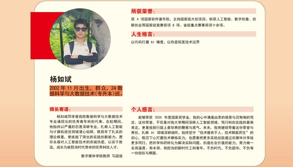 编者按:青春逢盛世,奋斗正当时。2024-2025学年,我校36名同学获“国家奖学金”。国家奖学金是我国高校学生奖励体系的最高荣誉之一,获奖者均为学子中的佼佼者,是践行德智体美劳全面发展的生动典范。他们以扎实学识筑牢根基,以责任担当凝聚同伴力量;秉持明德之心,怀揣强能之志,以励志之力,行笃行之举;锤炼本领、传递温暖,以标杆之姿诠释新时代青年的责任与担当。