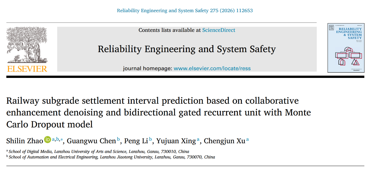 近日,我校数字媒体学院(计算机学院)青年教师赵世林在国际可靠性工程领域顶级期刊《Reliability Engineering & System Safety》(简称RESS)上发表题为《Railway subgrade settlement interval prediction based on collaborative enhancement denoising and bidirectional gated recurrent unit with Monte Carlo Dropout model》的研究成果。该期刊实时影响因子12.2,h指数为119,多年持续入选中国科学院工程技术领域一区TOP期刊,是国际公认的可靠性工程领域权威期刊。