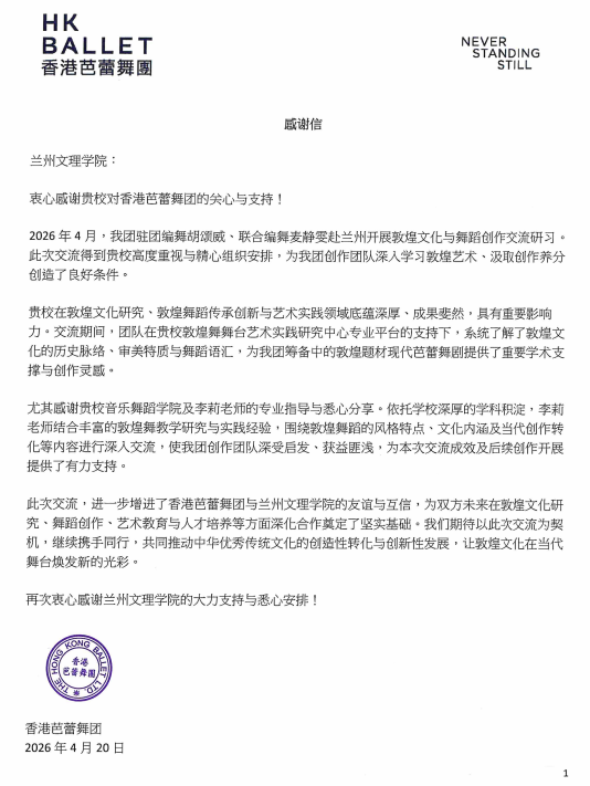 学习交流结束后,香港芭蕾舞团专门致信感谢,对学校的精心组织和专业指导表示诚挚谢意,认为此次研习为敦煌题材芭蕾舞剧创作提供了重要学术支撑与灵感启发,为两地长期交流合作奠定了坚实基础。