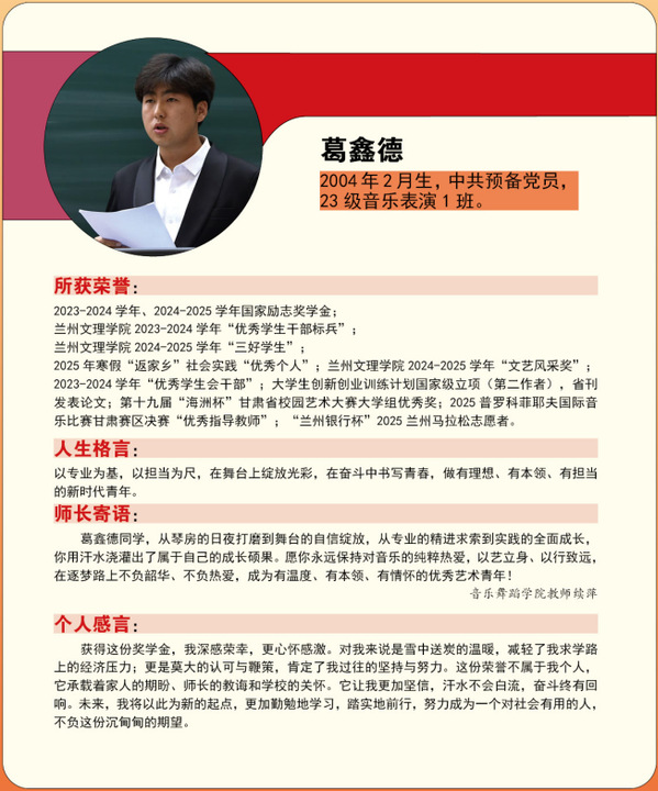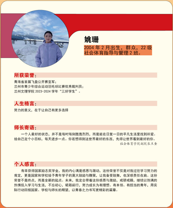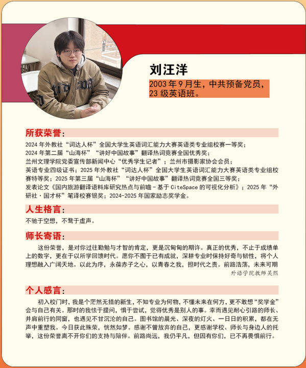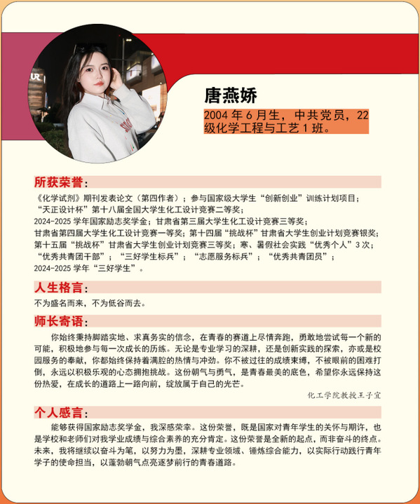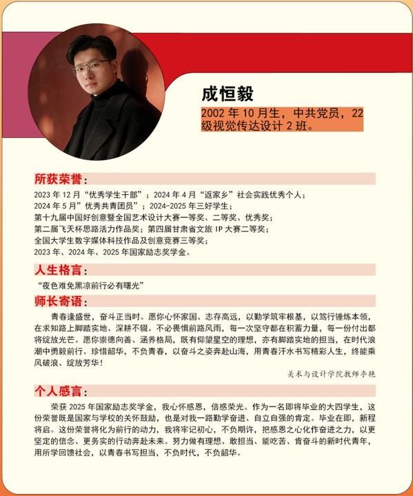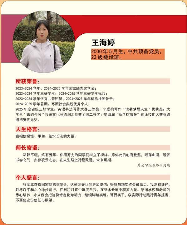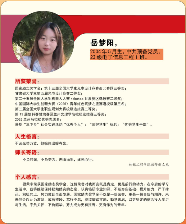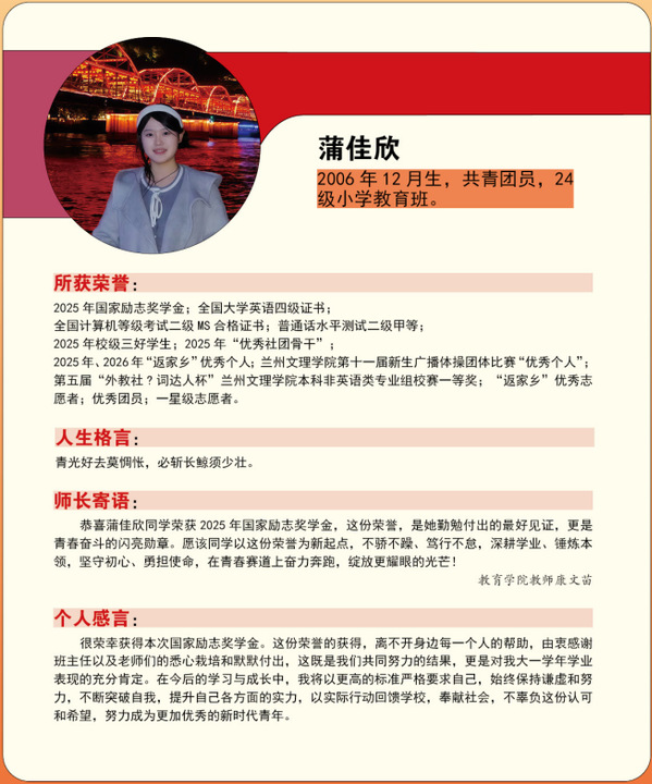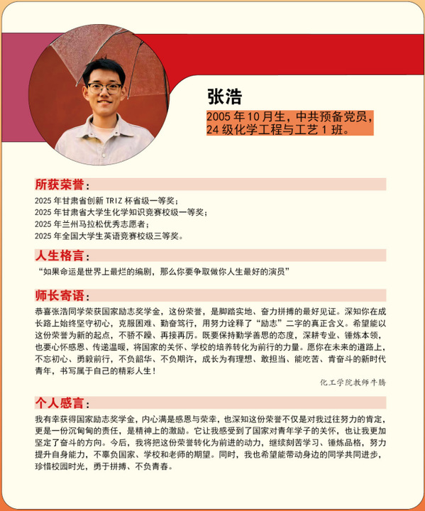 编者按:青春逢盛世,奋斗正当时。2024-2025学年,我校365名同学获“国家励志奖学金”。国家励志奖学金是为了激励普通本科高校、高等职业学校和高等专科学校的家庭经济困难学生勤奋学习、努力进取,在德、智、体、美等方面全面发展,由中央和地方政府共同出资设立的,奖励资助品学兼优的家庭经济困难学生的奖学金。获奖者均为学子中的佼佼者,是践行德智体美劳全面发展的生动典范。他们以扎实学识筑牢根基,以责任担当凝聚同伴力量;秉持明德之心,怀揣强能之志,以励志之力,行笃行之举;锤炼本领、传递温暖,以标杆之姿诠释新时代青年的责任与担当。
