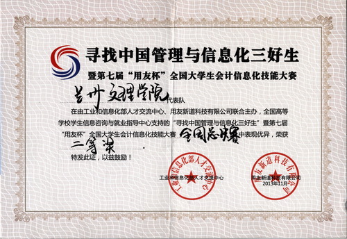 “寻找中国管理与信息化三好生”――暨第七届“用友杯”全国大学生会计信息化技能大赛于11月23日落下帷幕,兰州文理学院经管学院程慧珍、李红阳、董亚坤、景瑞、郭赛男代表学校参赛,喜获团体二等奖。
