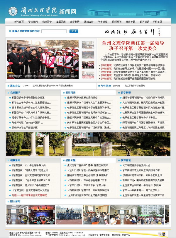兰州文理学院网络新闻宣传已形成了新闻网、校园网络电视台、校园网络广播台、官方微信、新浪微博、今日头条为核心的新媒体宣传矩阵。拥有一支青春向上,技术过硬的教师和学生团队。