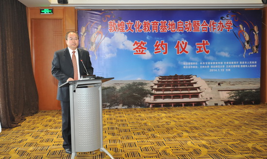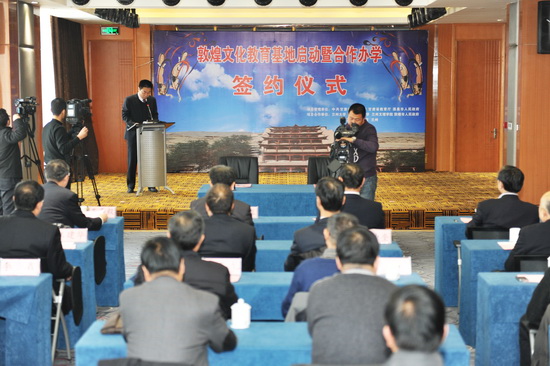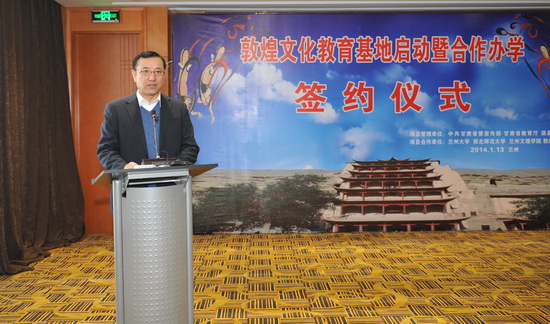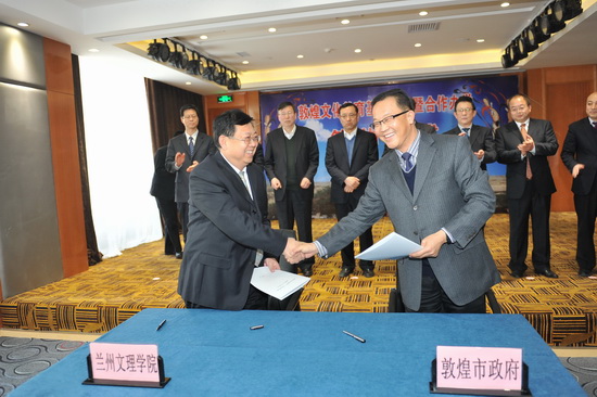 2014年1月13日,敦煌文化教育基地建设启动暨合作办学签约仪式在兰州举行。省委常委、省委宣传部部长连辑出席签约仪式并发表重要讲话,省委宣传部,省教育厅、人社厅、财政厅、旅游局、敦煌研究院、文化厅、科技厅、住建厅、国土厅,兰州大学、西北师范大学、兰州文理学院和敦煌市等单位领导以及相关部门负责人60余人出席了签约仪式。签约仪式上,兰州大学校长王乘、西北师范大学党委书记刘基、兰州文理学院党委书记史百战分别致辞,兰州大学校长王乘,西北师范大学校长刘仲奎、兰州文理学院校长汪建华分别与敦煌市签署了合作办学协议。