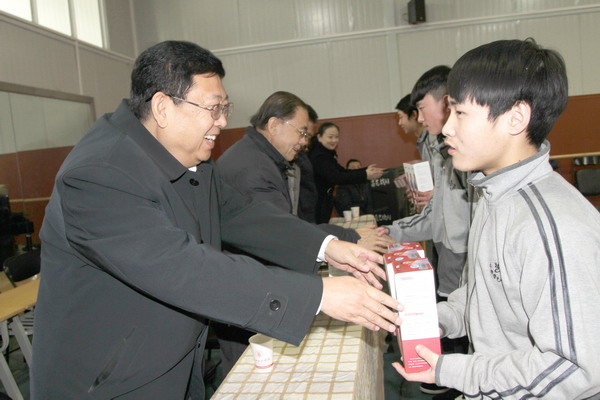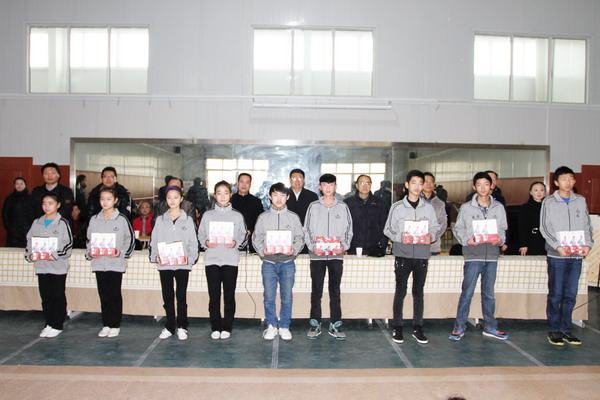 最后,汪建华校长一行为同学们发放了水杯、水果等新年礼物。