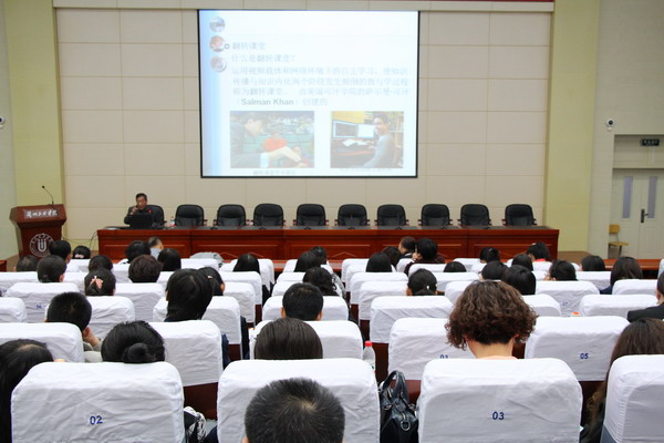 讲座中,杨改学院长首先就当前教育行业发展现状作了深入分析,通过对比中西方教育特点,指出微课教育的创新性以及在教师实际教学工作当中的重要性。杨院长指出,当前学校教育中,要注意提高教师应用信息技术的水平、提高教学效率、提高教学效果,要通过更新教学管理,提高学生应用信息技术手段,提高学生解决问题的能力。教师要利用微课教育,翻转课堂,从知识的传播者,变成知识的辅导者。培训会上,杨院长还为大家播放了多个微课教学视频,为全体教师作了示范。