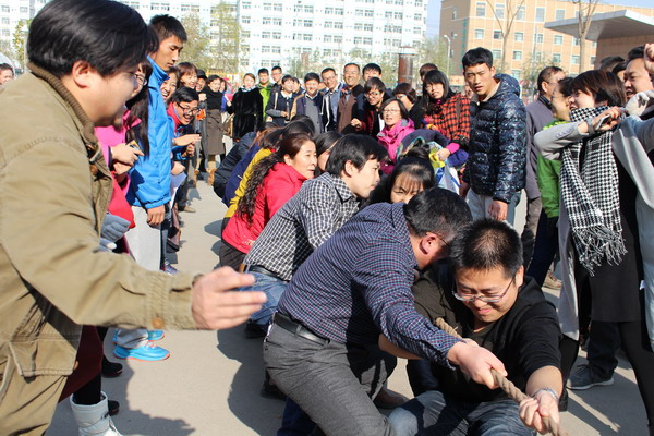 11月26日中午,兰州文理学院2015年教职工拔河比赛圆满落幕。本次比赛参与面广,全校18个分工会全部参赛,共有270多名教职工参加了比赛。比赛场面紧张激烈,精彩纷呈。激烈的比赛场地旁边围站着许多观众和加油助威的同学,他们时而呐喊、时而凝神观看,现场气氛十分活跃。比赛过后,无论谁胜谁负,每位教工的脸上都洋溢着开心灿烂的笑容。