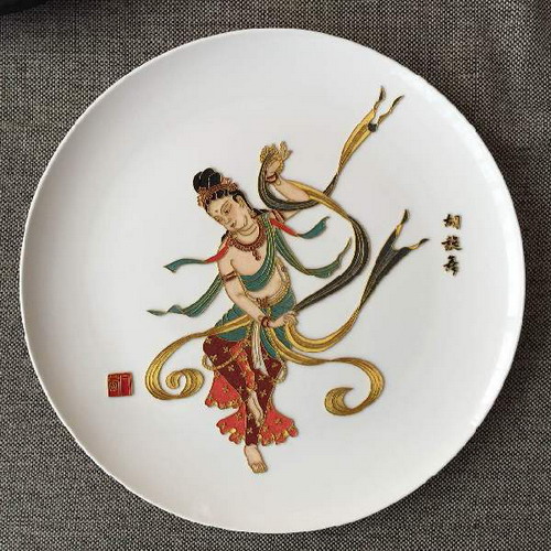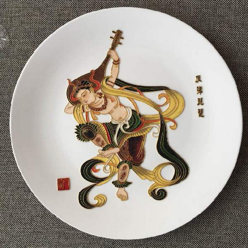 据了解,甘肃的舞美设计师们以“一带一路”为指导理念,发挥敦煌艺术的巨大影响和优势,以敦煌手绘、彩塑、掐丝艺术画、图片、模型等丰富多彩的敦煌文化作品亮相展会,来自全国的专家学者特别对我校白茜老师创作的掐丝艺术作品敦煌壁画《反弹琵琶舞乐图》、《文殊菩萨赴会图》给予了高度的评价。白茜所创作的掐丝艺术作品色彩丰富饱满,采用金丝天然矿物颜料,具有极强的立体效果,尤其是其在瓷盘、瓷板上所创作的敦煌壁画人物造型栩栩如生、独具特色。