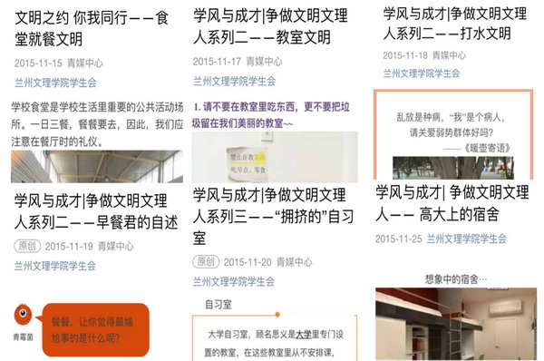 1. 以青年学生喜闻乐见的方式营造氛围。“雁苑青年”大学生网络文化中心策划了“文明之约,你我同行”系列宣传活动,用漫画、漫说等青年学生乐于接受的形式,以幽默、轻快的语言,或呈现校园不文明现象,或宣传校园文明行为,从语言文明、行为文明、教室环境、宿舍安全、食堂秩序等多方面争做校园文明使者,将原本简单、枯燥的号召变得轻松、愉悦,使同学们在兴致勃勃的网络阅读中得益。