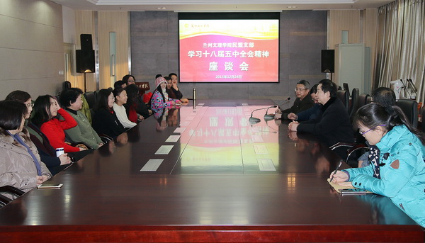 12月24日下午,我校民盟支部举行“学习中共十八届五中全会精神”座谈会。会议由副校长、民盟兰州文理学院支部主委王克太主持,20余名盟员参加。甘肃省民盟专职副主委魏其奎、秘书长周洁民出席座谈会。