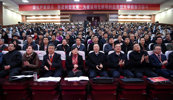 会场上气氛庄重而热烈,主席台正中的中国共产党党徽光彩夺目,10面鲜艳的红旗分列两侧。主席台对面“深化产教融合 推进转型发展 为建设特色鲜明的应用型大学而努力奋斗”的标语振奋人心、催人奋进。