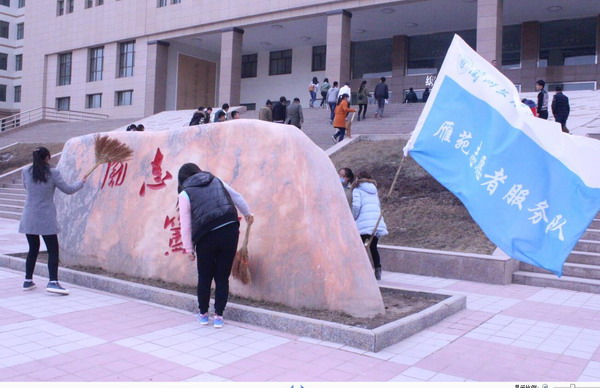 学雷锋洁净校园活动。3月4日下午, 文理学院校园一派热火朝天的景象,这是 “雁苑志愿者服务队”13个学院的青年志愿者们正在开展“学雷锋你我在行动”――洁净校园活动,同学们不怕苦、不怕脏,自带工具积极参加,有的清扫安亭广场,有的清理花园垃圾,有的擦洗校门,有的擦洗教学楼、图书馆玻璃门,有的整理图书馆内部……在学校各个角落都能看到他们辛勤劳动的身影。经过同学们的共同努力,校园环境愈加清洁整齐。