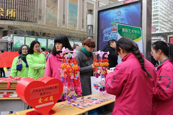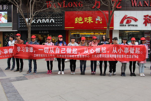 学雷锋关爱特殊儿童活动。3月4日下午,“雁苑志愿者服务队”青年志愿者协会新闻分会的志愿者和兰州各大高校的志愿者共同在张掖路步行街参与了由城关区文明办发起的“弘扬雷锋精神,关爱特殊儿童,促进社会和谐”的大型志愿者活动。志愿者们有序的分组义卖金宝贝特教中心的孩子们及家长们制作的工艺品,为帮助特殊儿童进行社会融合贡献了一份力量。