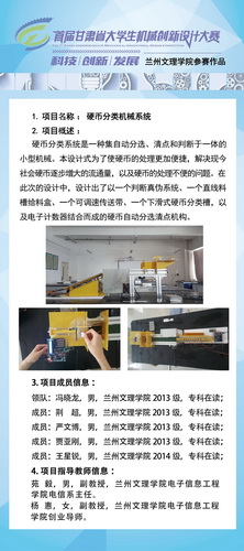 我校代表队由电子信息工程学院教师苑毅、杨惠,学生荆超、冯晓龙、严文博、贾亚刚和王星锐组成。他们研发的《硬币分类机械系统》具有对硬币分类、判断和清点功能。装置工作原理和机械结构受到评审专家的好评,引起了广大师生的关注。