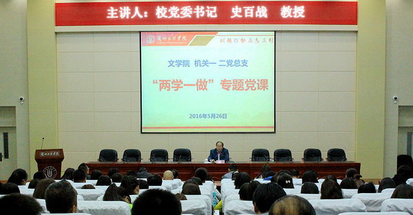 史书记结合学党章党规,践行学校转型发展,开展“两学一做”学习教育的重要意义,做了题为《扎实开展“两学一做”有力推进转型发展》的党课。史书记在授课中指出,一要抓好学习是基础。全体党员要认真学习党章党规,牢记党规党纪,明确该做什么、不该做什么。史书记就学习的意义、学习的目的及学习的方式提出了要求,党员干部要在学习教育实践中要结合本部门工作实际,“带着目的学,针对问题改”,最终落脚点是做一名符合“四讲四有”要求和践行“为人民服务”宗旨的合格党员。二要做合格党员是关键。强化党员意识,每位党员自觉按照党员标准规范言行,进一步坚定信念,提高党性觉悟;强化宗旨观念,勇于担当作为,要把党员的先锋形象树起来,发挥先锋模范作用;提升党员素质,增强政治意识、大局意识、核心意识、看齐意识,坚定正确政治方向。三要自觉践行学校的转型发展。首先是发挥党支部先锋引领作用,严格执行“三会一课”制度,结合专业学科建立党支部,充分发挥党支部的战斗堡垒作用,积极做好专业学科的建设。文学院要明确自己肩上的担子,是文化底蕴传承的主要承载者,是学校四大方向的主体学科。文学院要高度重视传承和创新,积极探究汉语言文学教学创新与文化产业方面的专业链。其次是作为机关部门要树立为中心工作服务的意识,增强责任意识。学习要讲实效,工作要讲实效。四要严以律己,认真履行好领导干部的“一岗双责”制度。日常工作中既要认真履行管理职能,更要狠抓党风廉政建设,切实用好学校及全体师生赋予的“公权”,严谨假公济私、擅权妄为,自觉接受监督。