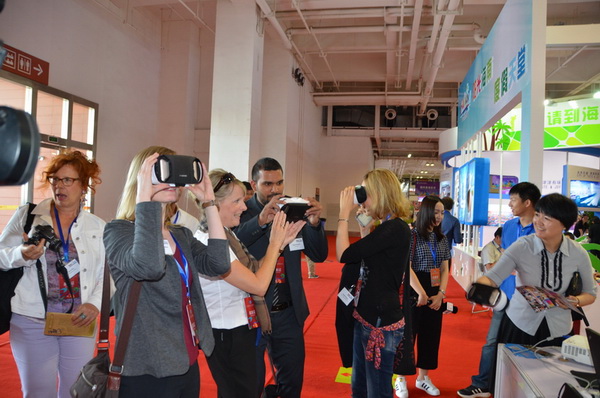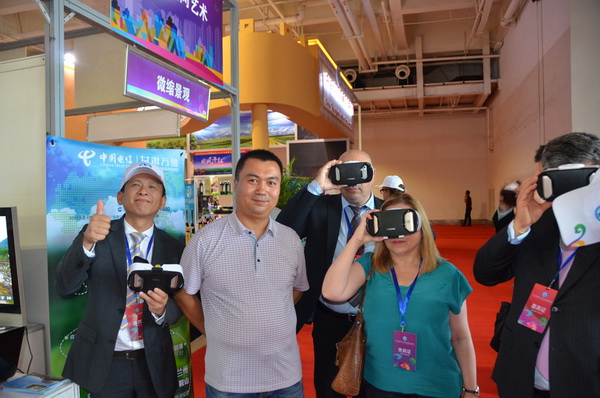在陇南智慧旅游展区,由兰州文理学院VR虚拟旅游研发团队设计开发的“VR美丽乡村虚拟旅游平台”吸引了大量游客驻足观看并争相“尝鲜”。外国朋友纷纷戴上VR眼镜来回转身、弯腰俯首,体验感受一番别样的康县美丽乡村3D景观,连连发出一声声惊叹,成为本次展会最热闹的展区之一。