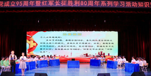 6月24日19:30,为纪念中国共产党成立95周年暨红军长征胜利80周年,推进全校“两学一做”学习教育深入开展,我校在实验剧场举行“纪念中国共产党成立95周年暨红军长征胜利80周年系列学习活动”知识竞赛总决赛。