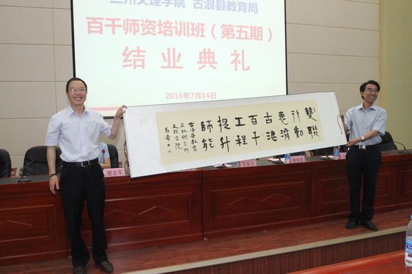 随后,古浪县委、县政府向我校赠送内容为“双联行动惠济古浪,百千工程提升师能”的书法作品以作纪念。培训班学员代表发表了培训感言,古浪县县委宣传部长林艳军同志和我校党委副书记普登学同志,分别就百千师资工程培训做了总结讲话。