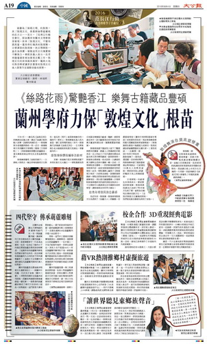 8月4号,香港《大公报》专版报道我校在甘肃地方传统文化,敦煌文化的传承及服务地方经济发展情况进行报道。