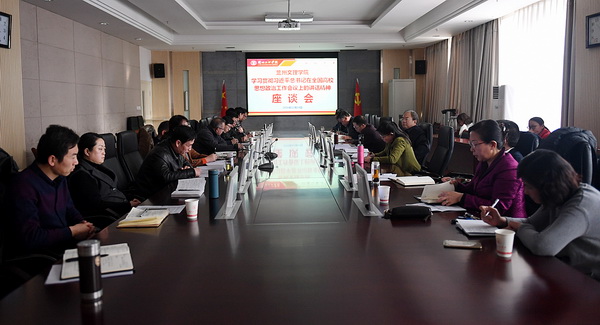 12月14日下午,我校召开学习贯彻习近平总书记在全国高校思想政治工作会议上的讲话精神座谈会。校领导史百战、普登学、张兆勤出席了座谈会。各党总支书记参加了座谈会,座谈会由校党委书记史百战主持。