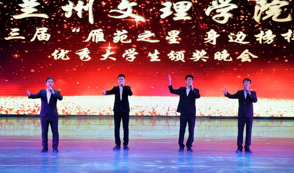 晚会上,同学们还表演了精彩的文艺节目。男生四重唱《跟你走》唱响了一首信仰之歌,激励着同学们坚定信念,奋斗青春。诗歌朗诵《青春致敬》表达了我校青年学生奋发有为,敢于担当的情怀。舞蹈《戈壁沙丘》、《水姑娘》,歌曲联唱《青春之歌》等节目都展示了我校青年学子积极向上,朝气蓬勃的精神面貌。颁奖晚会在大合唱《祖国颂》和《雁苑之歌》中圆满落下帷幕。