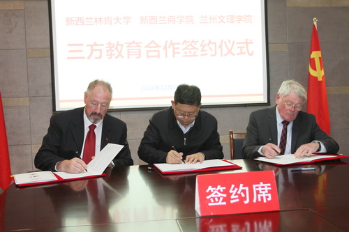 2016年 12月15日,新西兰商学院董事长、校长Jason Ho、新西兰商学院副校长Jack Radford、新西兰林肯大学物流系主任Mark Wilson等一行来我校访问并与我校签订了三方教育交流合作协议。校长汪建华会见来访外宾并出席三方教育交流合作协议签约仪式。签约仪式由副校长张焱主持。