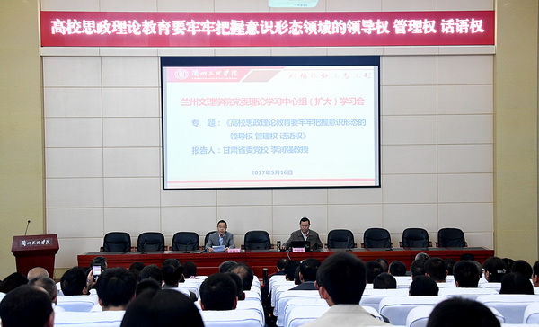5月16日,我校在综合楼学术报告厅召开党委理论学习中心组(扩大)学习会,专题学习高校意识形态工作。甘肃省委党校副校长李润强教授作了题为《高校思政理论教育要牢牢把握意识形态的领导权 管理权 话语权》的报告。校党委书记史百战等校领导、校院两级中心组成员、正高职称人员、各民主党派负责人、马克思主义学院教师、各学院团学负责人、全体辅导员共100余人参加学习会。会议由校党委副书记普登学主持。