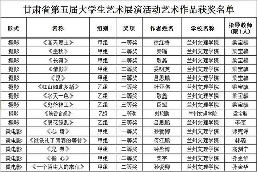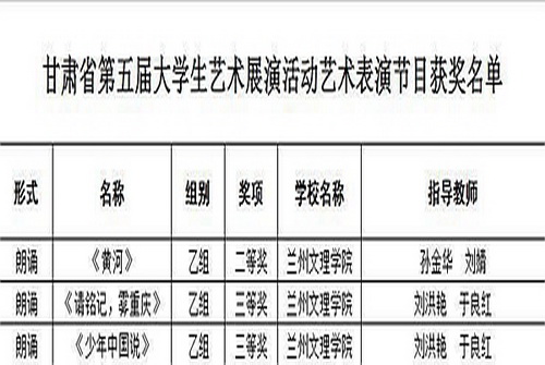 日前,省教育厅公布了全省第五届大学生艺术展演活动优秀组织奖及各项目评选结果,我院师生获得多项奖励。其中,艺术表演节目类获得二等奖1个、三等奖2个;艺术作品类获得一等奖4个、二等奖7个、三等奖4个(具体获奖名单附后)。