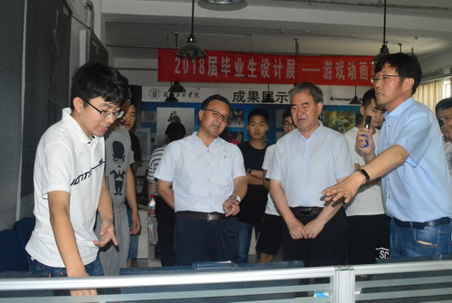 启动仪式暨表彰大会结束后,各位校领导及全体师生前往数字媒体教学实践中心参观我院2018届学生毕业设计展出。
