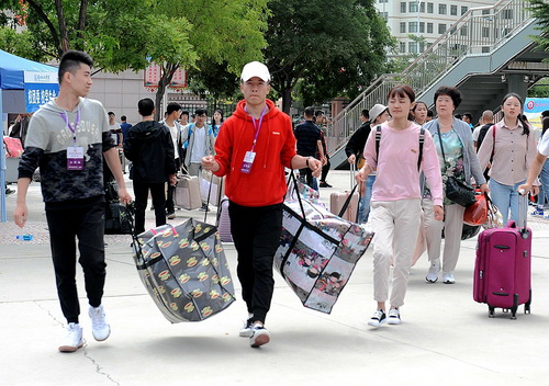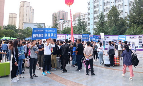 学校在南北校区门口和雁苑广场设立了迎新服务点。校门口,志愿者帮新生拎行李、指引道路,耐心地与新同学和家长沟通。广场上,各学院迎新点工作人员热情礼貌地向新生解答疑问,带领新生前往报名登记点和各学院新生宿舍。