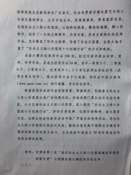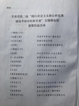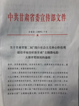 据悉,甘肃省“践行社会主义核心价值观,建设幸福美好新甘肃”主题微电影大赛是甘肃省委宣传部为深入贯彻落实习近平新时代中国特色社会主义思想和党的十九大精神,培养和践行社会主义核心价值观,进一步弘扬共筑美好生活梦想的时代新风,落实中宣部等6部委《关于进一步加强社会主义核心价值观网上传播的通知》精神,在2018年10月举办的大型主题微电影比赛。