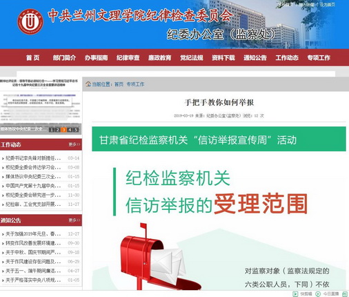 校纪委以“六个知晓”(知晓纪检监察机关信访举报的受理范围、知晓纪检监察工作的关注重点、知晓举报人的权利和义务、知晓该到哪里去反映问题、知晓诬陷制造假证行为必须承担的纪律和法律责任、知晓信访举报的办理原则和程序)为目标,在校党委宣传部、校团委、信息中心的协同配合下,采取群众看得见、听得进、易理解、能接受的方式,广泛向干部群众宣传纪检监察信访举报相关知识。 制作了宣传展板在显著位置展示;电子屏滚动播出宣传视频《纪小帅课堂:纪检监察信访举报攻略》和“信访举报宣传周”主题;向师生和群众分发编印的信访举报有关事项指南,现场接受咨询;校纪委网页专设“信访宣传周”栏目,全面介绍纪检监察机关信访工作有关事项及要求等,通过多种形式引导干部群众“阳光信访”、理性维权,同时促进学校纪检监察部门信访举报办理进一步规范化、有效化。
