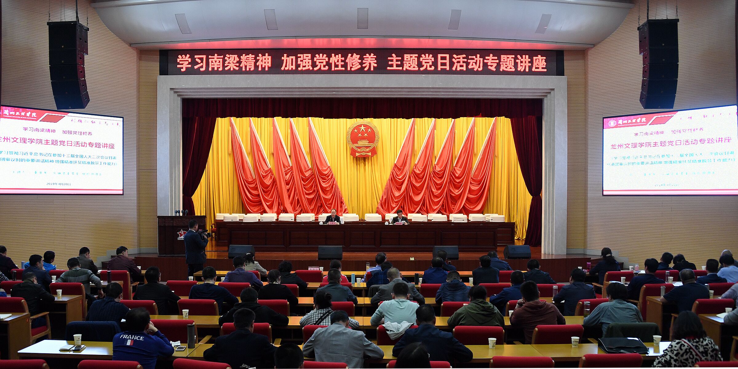 2019年4月20日晚7点,兰州文理学院“学习南梁精神,加强党性修养”主题党日活动专题讲座第二讲在华池县南梁法官教育基地讲法堂举办。庆城县委常委、组织部部长秦亚军作了《学习宣传贯彻习近平总书记在参加十三届全国人大二次会议甘肃代表团审议时的重要讲话精神 增强精准扶贫精准脱贫工作能力》的专题讲座。参加主题党日活动的校领导、中层以上党员领导干部以及定点帮扶贫困村书记(主任)共100余人参加。校党委副书记普登学主持讲座。