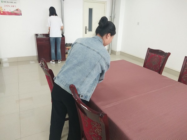 当天下午2:30,参加义务劳动的学生们一起拿上抹布、扫帚,垃圾匣、垃圾袋等卫生工具准时来到综合楼6楼旅游学院的茶艺培训室、茶艺茶花室等培训室门前,分工合作,大约40分钟后,各个培训室的垃圾都被清理干净。下午3:30,大家又一起抵达四楼上导游模拟室、文物陈列室、画室及苹果智慧实训室等区域,由班干部划分了任务后,大家分成了室内卫生组与走廊卫生组,室内卫生组负责打扫各培训室的地面及擦拭桌子,走廊卫生组负责清理走廊地面、厕所及休息区卫生。经过一小时的劳动,旅游学院整体办公区域的面貌焕然一新,窗明几净。