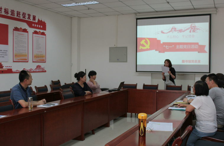 7月2日下午,图书馆第一支部、第二支部在九楼会议室,联合举办了“迎七一、颂党恩,不忘初心跟党走”主题党日活动。活动由总支委员会委员杨秀平主持,图书馆两个支部的全体党员参加了活动。