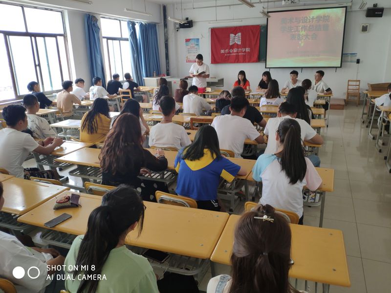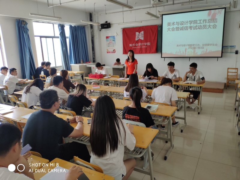 2019年7月3日中午,美术与设计学院在1-504召开期末学生工作总结大会暨诚信考试动员大会。大会由学生办公室主任唐艳丽老师主持,分团委负责人张瑶老师、分团委学生会成员、全体学生干部及各班班委参会。