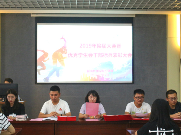 为进一步充实学院学生会干部队伍,为学院分团委、学生会补充新鲜血液,促进学院分团委、学生会向良好态势发展,2019年7月9日晚,新闻传播学院分团委在视频会议室召开分团委、学生会2019年换届大会暨优秀学生会干部标兵表彰大会,学院分团委负责人吴文娟,分团委、学生会全体成员、第四届干部代表、2017、2018级各班级团支部书记、班长共计60余人参加换届表彰大会,会议由学生会轮值副主席李豫主持。