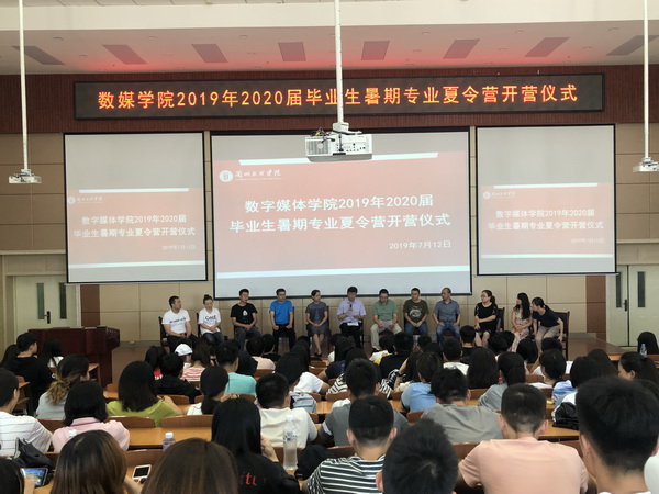 7月12日下午,数字媒体学院在5-205教室举办了数字媒体学院2019年2020届毕业生暑期专业夏令营开营仪式。开营仪式由数字媒体学院院长李恒杰主持,党总支书记陈小琴、校企合作办主任蔺国梁、数字媒体技术系系主任黄珍、数字媒体艺术系系主任王士勇、计算机系系主任张旭、创新就业办主任姚林、2020届毕业生班主任及各班学生参加了开营仪式
