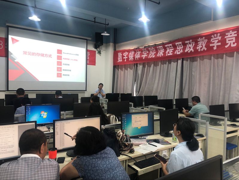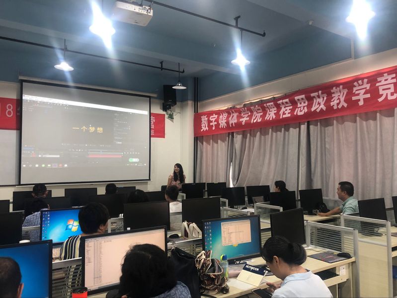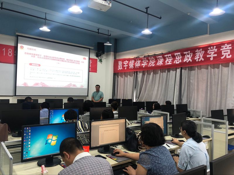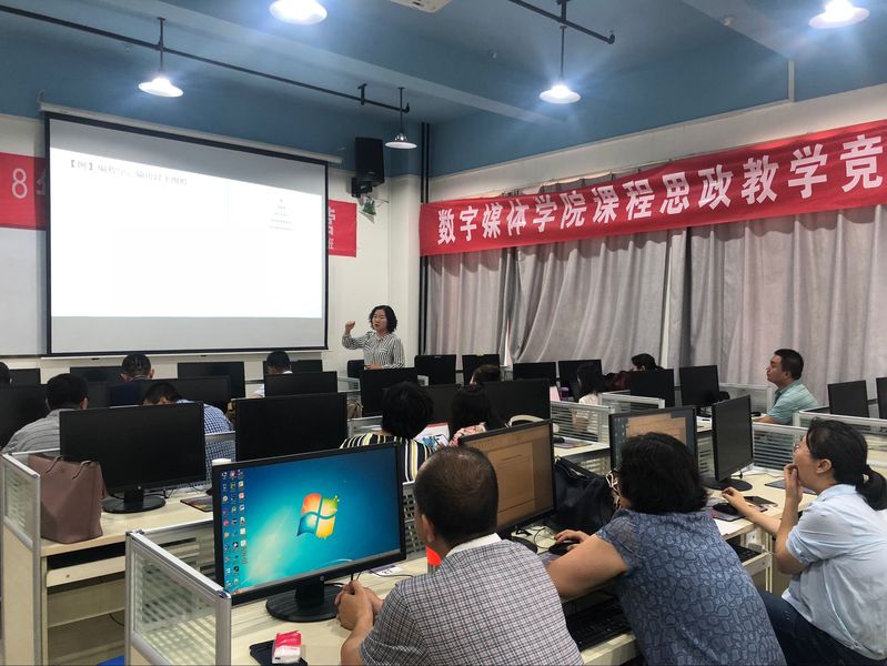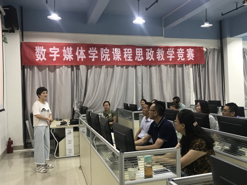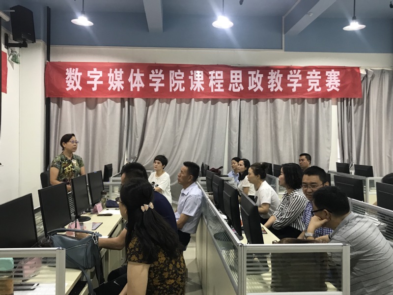 2019年7月22日上午,数字媒体学院在5-208实验室举办了院级“课程思政”教学竞赛。竞赛邀请校外专家作为评审专家。竞赛由学院教学副院长邢玉娟主持,学院党总支书记陈小琴、全体专任教师进行了观摩。