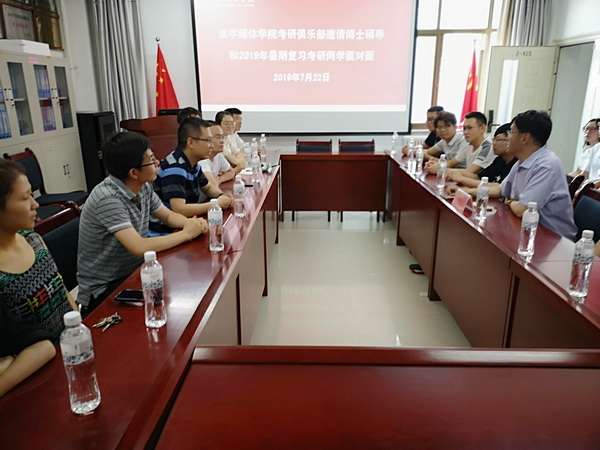 为进一步提升考研学生备考效率,建立科学完备的复习体系,7月22日下午,我校数字媒体学院考研俱乐部在学院会议室成功举行“硕士生导师与数媒学院2019年暑期复习考研同学面对面交流座谈会”,考研俱乐部创办者、数媒学院院长李恒杰教授邀请兰州理工大学电信学院硕士生导师李恒杰博士、硕士生导师曾贤强博士、硕士生导师杨维满博士(原甘肃联合大学08届自动化本科班学生)一行三人莅临我校,走进数字媒体学院考研俱乐部,为我院2019年暑期复习考研同学就考研问题答疑解惑,互动交流。学院16级考研意向学生近30人参加了此次交流,活动由数字媒体学院院长李恒杰教授主持。