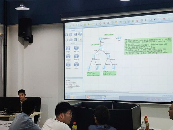 汇报会上,17计算机网络班的学生选举了两名学生代表依次展示了自己的作品,两位同学依次从企业的需求方面出发,利用之前的理论基础和这两周的实训经验,对整个企业网络进行分析、规划和OSPF、NAT等协议的配置,整个过程连贯流利,最后由学习委员曾丹对这次实训做了总结报告。