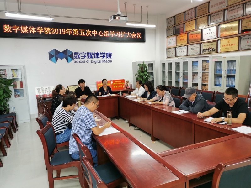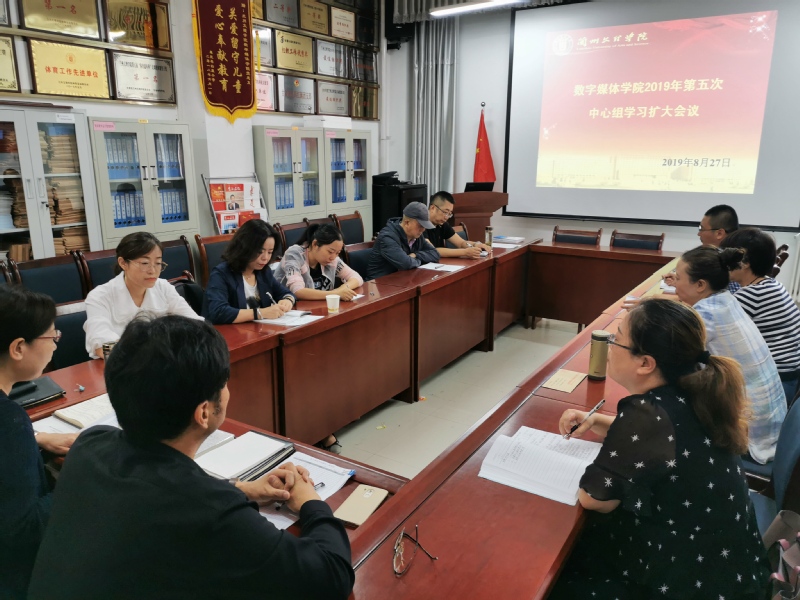 8月27日上午,数字媒体学院党总支在学院会议室组织召开2019年第五次中心组理论学习(扩大)会。学习会由党总支书记陈小琴主持,学院党总支成员、中层干部、党支部书记、学院内设机构负责人及教研室主任与会。