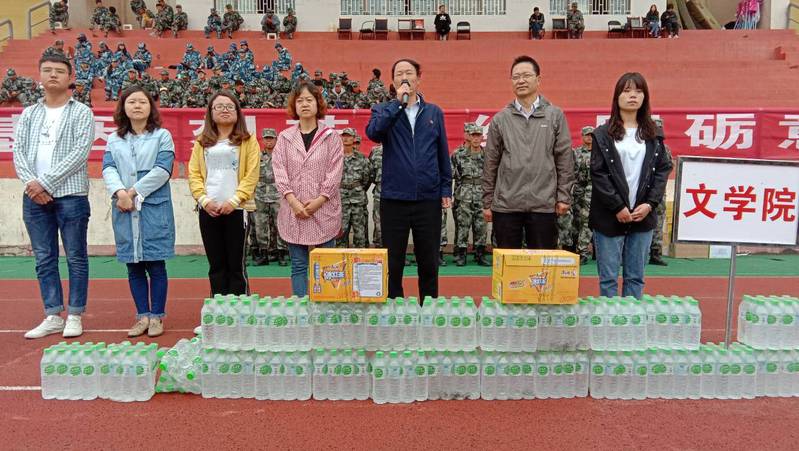 9月17日上午,文学院党总支书记郑建勤、副院长张彦荣、学工办、辅导员老师张春霓、白美丽、贾娜以及学生会成员在新生军训休息间隙慰问军训教官和2019级军训新生。