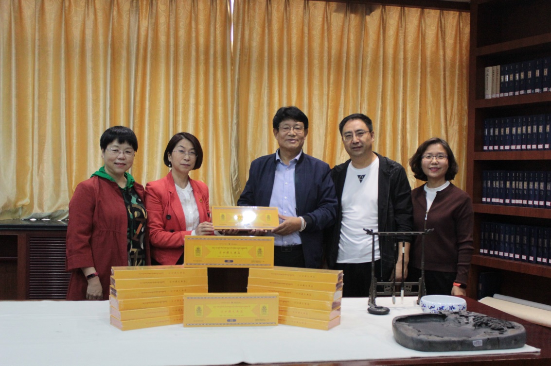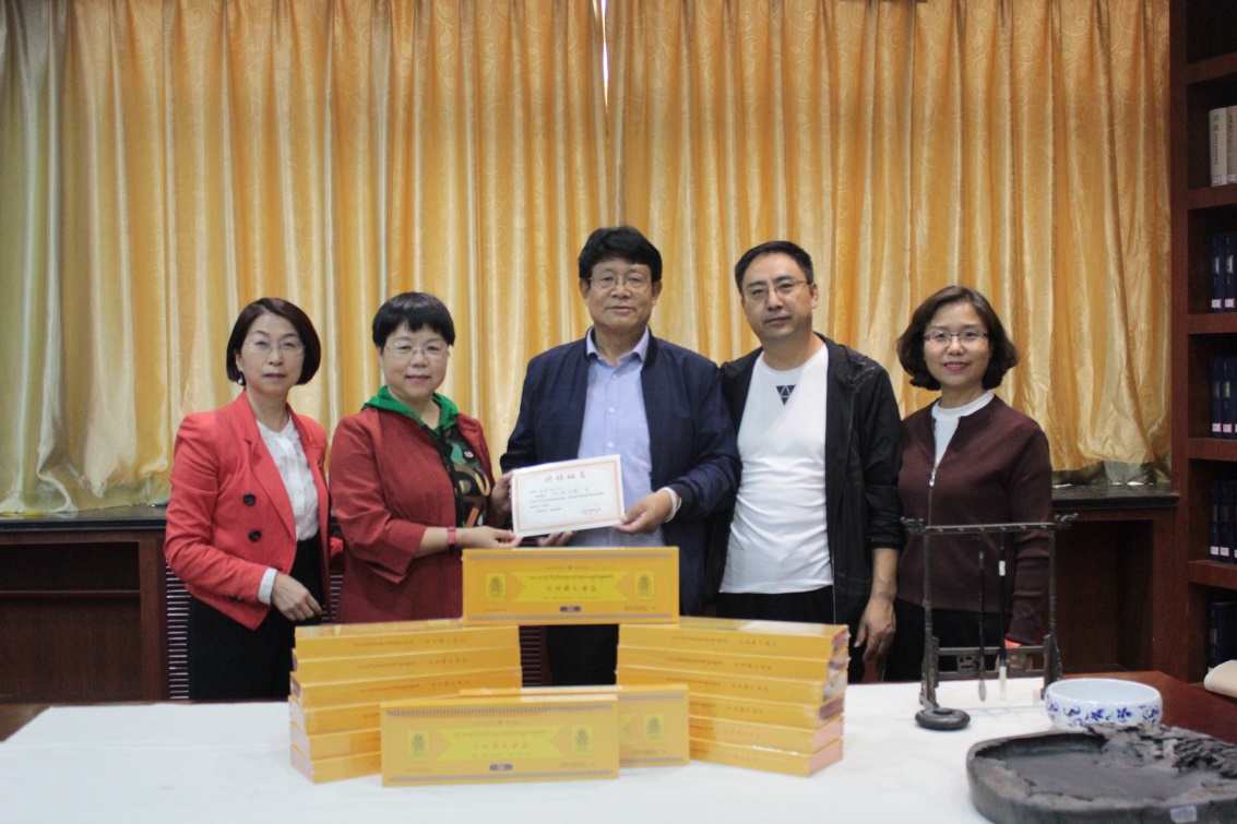 副馆长杨晓雯首先代表图书馆感谢道周教授向图书馆赠送了《凉州藏文典籍》,认为此次捐赠进一步丰富了我馆的馆藏,传承了中华优秀传统文化。科技处处长王源向道周教授颁发收藏证书并合影留念。
