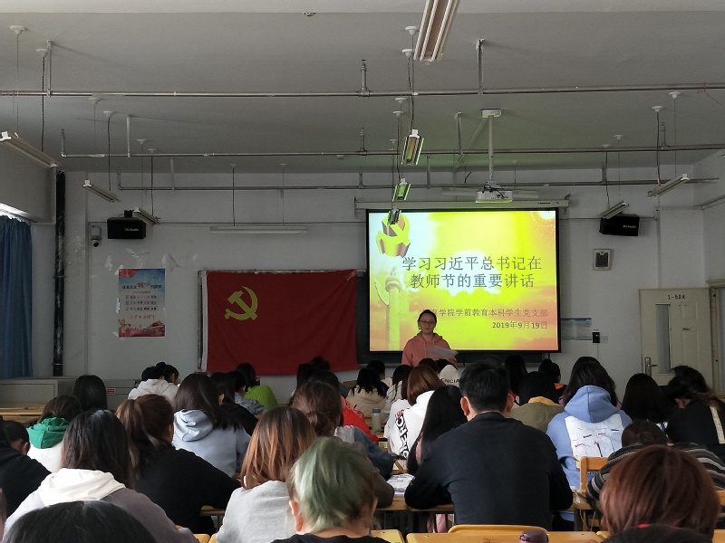 9月19日,学前教育本科学生党支部在1-504教室召开了深入学习“习近平总书记在教师节的重要讲话”的主题党日活动。参加本次学习的有支部书记王颖,以及学前教育本科支部全体党员、预备党员以及17级入党积极分子。